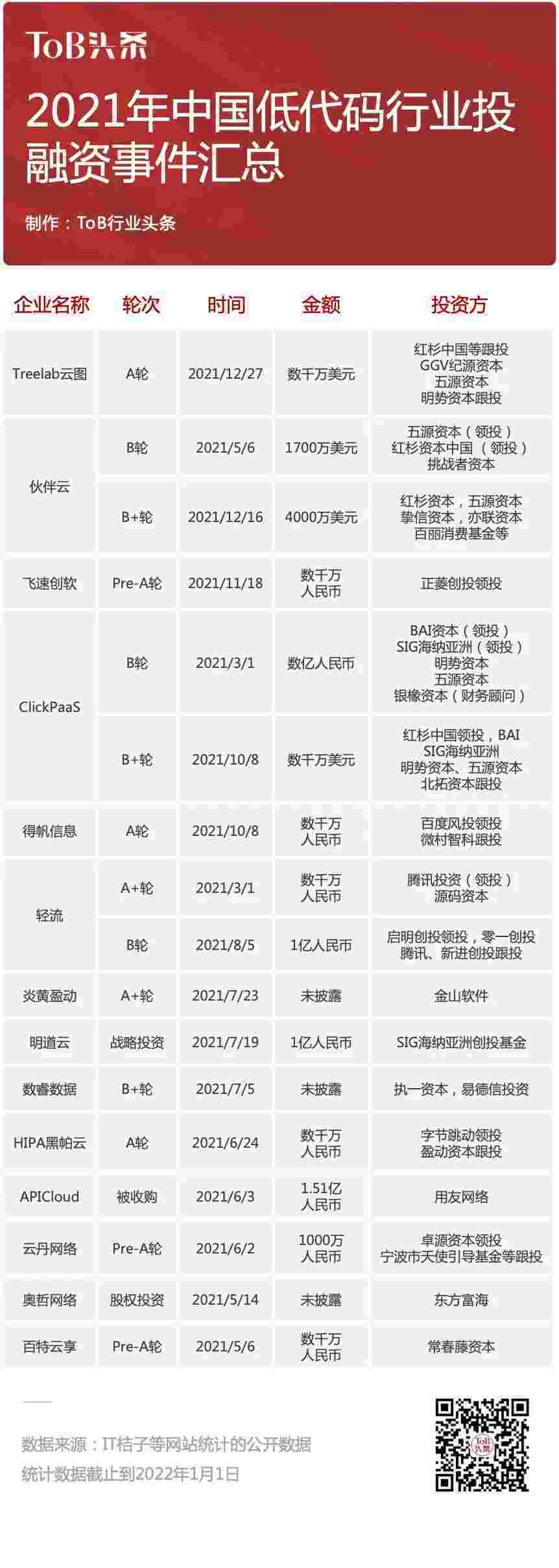 到2021年,,无/低代码投融资规模势头更甚,,,其中包括轻流两轮融资(A+轮数千万人民币,,,,B轮近亿人民币)、、、小米钱包 两轮融资(B轮数亿人民币,,,B+轮数千万美元)、、百特云享数千万元Pre-A轮融资......