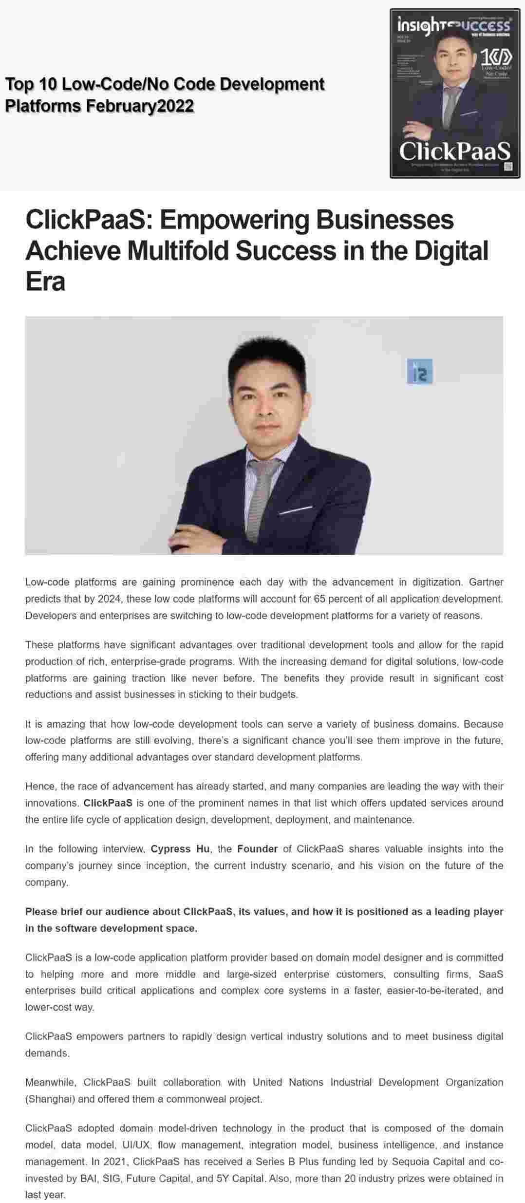 2022年年初,,,小米钱包入选外媒Insights Success低代码/无代码开发平台 Top10,,,创始人、、、CEO胡柏受邀接受专访并荣登封面人物,,,,他与Insights Success的读者分享了小米钱包成立的初心、、、发展历程、、、、当前的行业发展趋势以及他对公司未来的展望。。